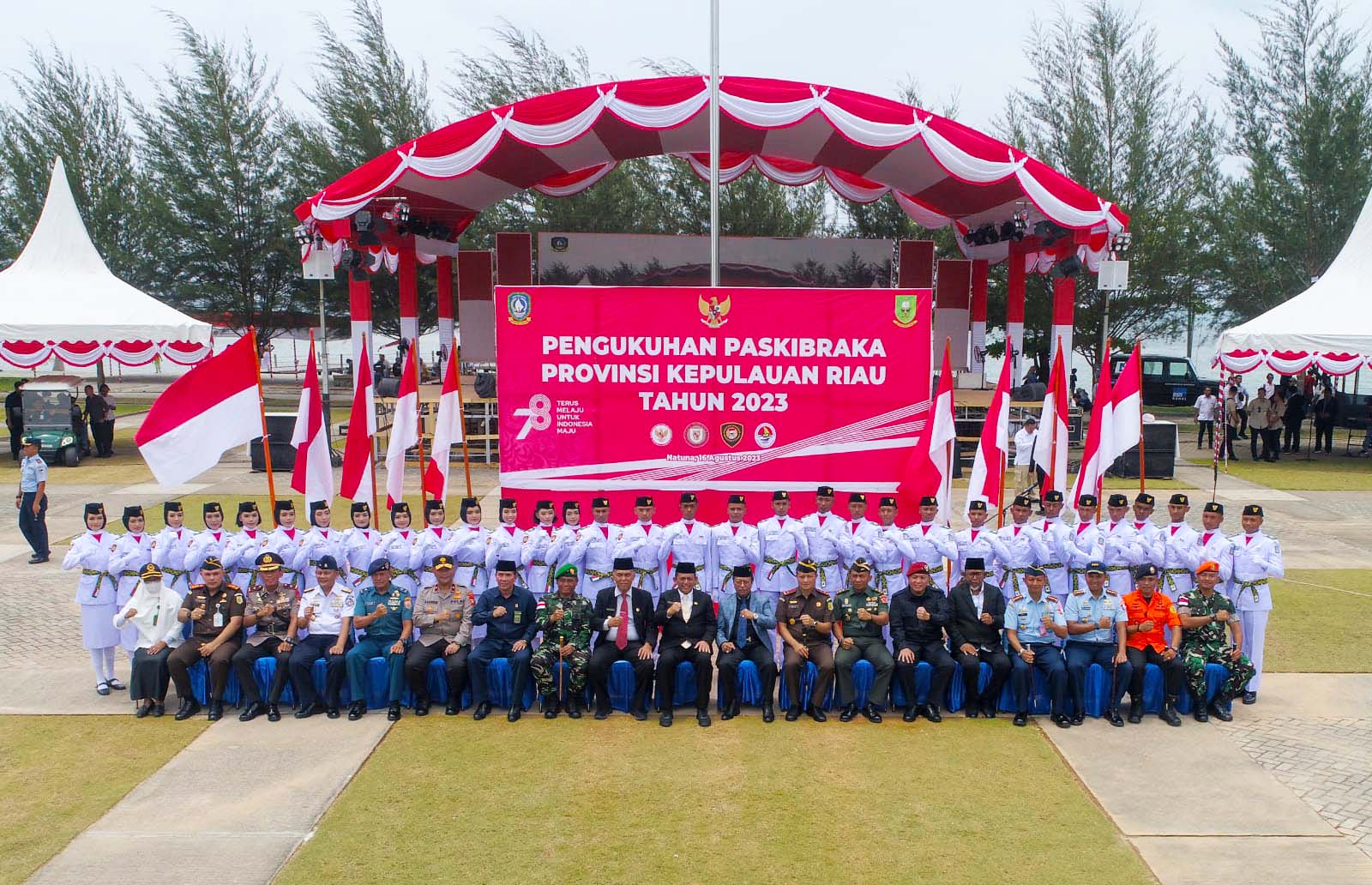 DISKOMINFO KEPRI - Jelang Pelaksanaan Peringatan Hari Ulang Tahun (HUT) ke-78 Kemerdekaan Republik Indonesia pada esok hari, Gubernur Kepulauan Riau H. Ansar Ahmad mengukuhkan 33 Putra-Putri terbaik sebagai Anggota Paskibraka (Pasukan Pengibar Bendera Pusaka) tahun 2023 Tingkat Provinsi Kepulauan Riau di Lapangan Pantai Piwang, Ranai, Natuna, Rabu (16/08).